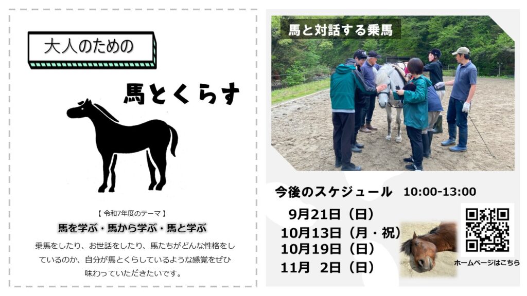 ・定員10名(先着順)・雨天の場合、馬のお世話や座学を開催いたします。(天候不良の場合キャンセル料は無料です。)・このプログラムは社会人以上の方が対象となります。
